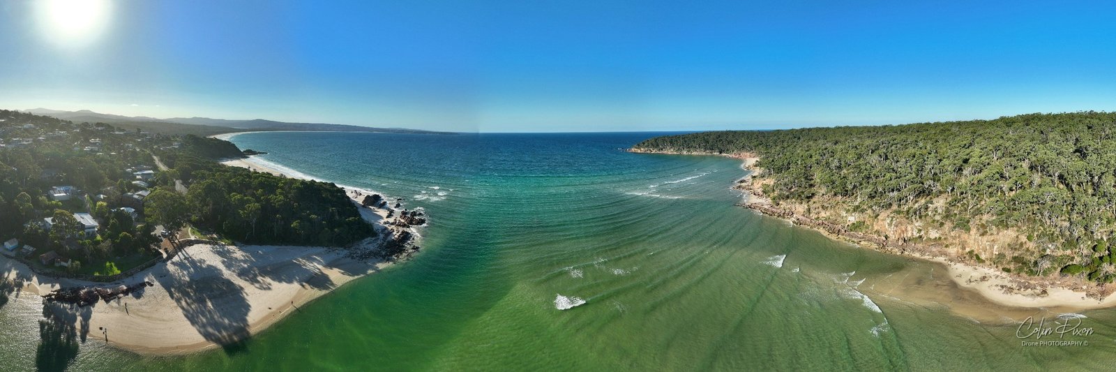 On a day where the autumn sun graced us with a generous warmth and a clear, endless azure sky, our journey begins not with footsteps but with the whirring of drone blades, taking to the skies above the Pambula River mouth. A breathtaking spectacle awaits—captured in the digital eyes of technology and the enduring heart of nature.