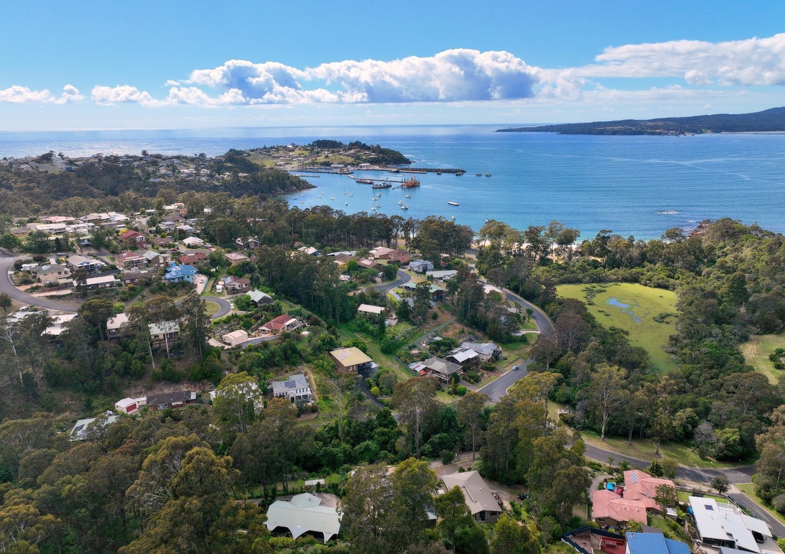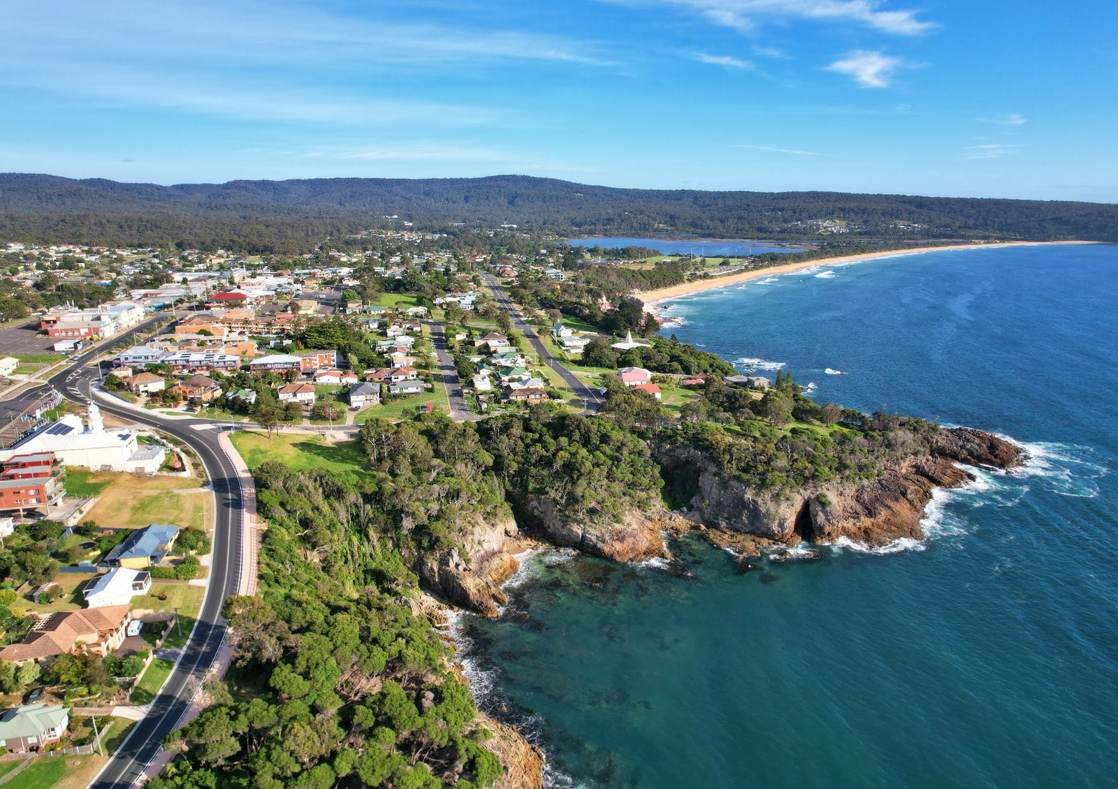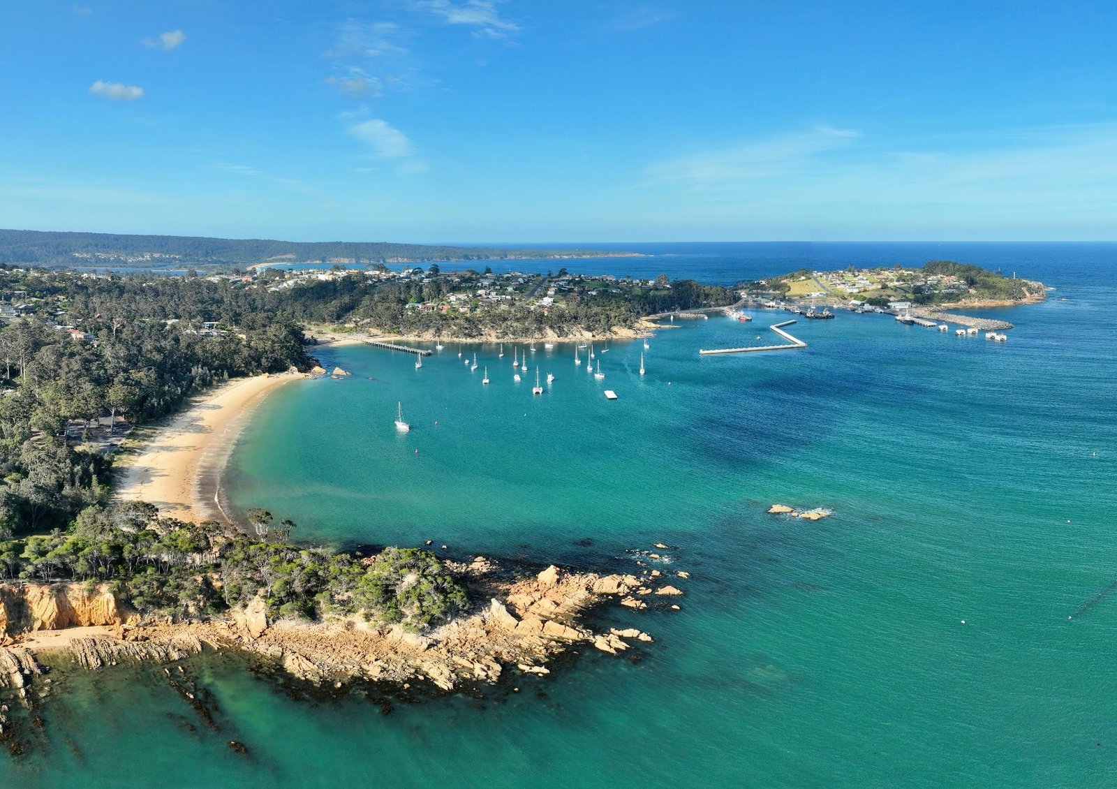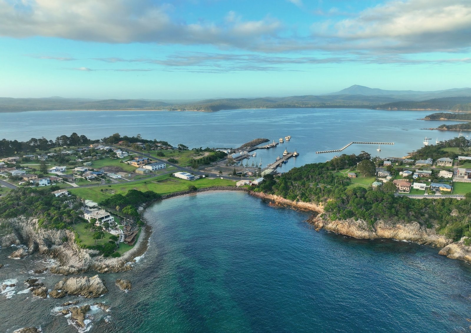 Looking east towards Snug Cove, this aerial shot captures Eden’s suburban area nestled along the coastline, overlooking Cocora Beach. The gentle curve of the bay, with calm blue waters reflecting the clear skies, offers a peaceful and inviting view of the town blending harmoniously with its natural surroundings.