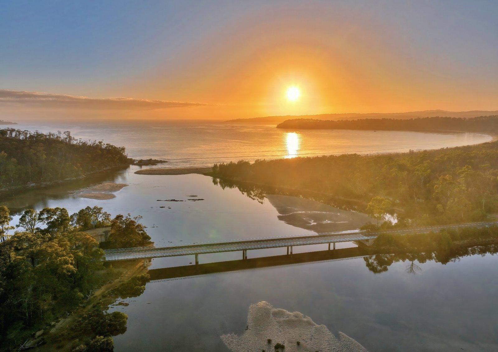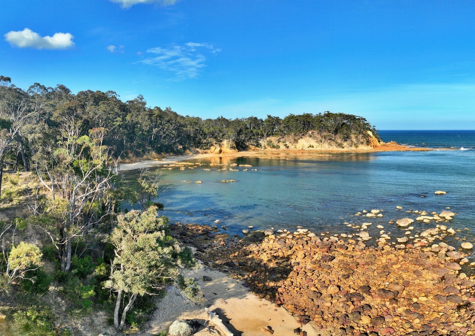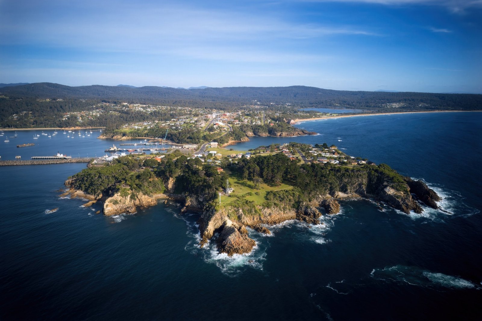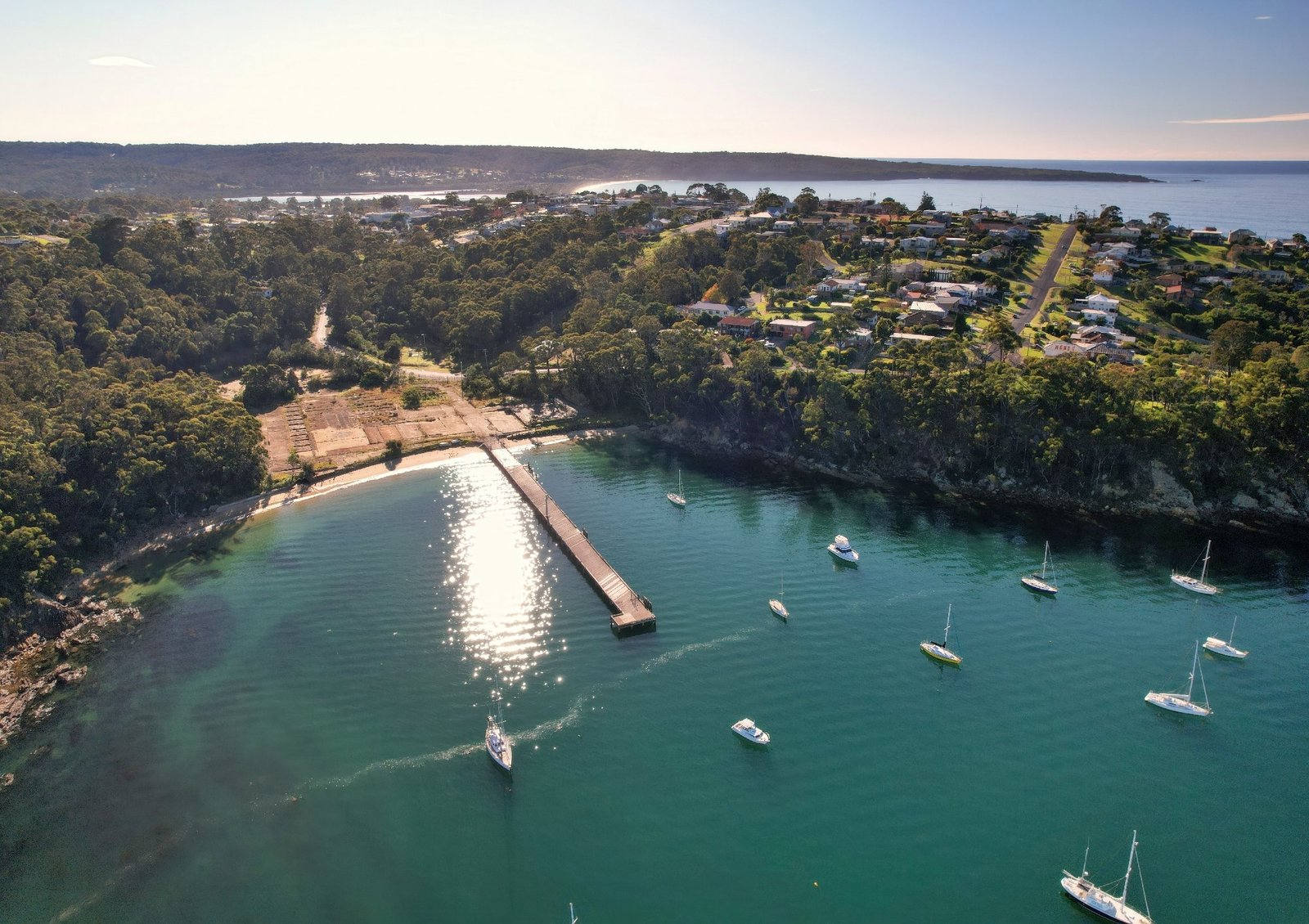 Looking east towards Snug Cove, this aerial shot captures Eden’s suburban area nestled along the coastline, overlooking Cocora Beach. The gentle curve of the bay, with calm blue waters reflecting the clear skies, offers a peaceful and inviting view of the town blending harmoniously with its natural surroundings.