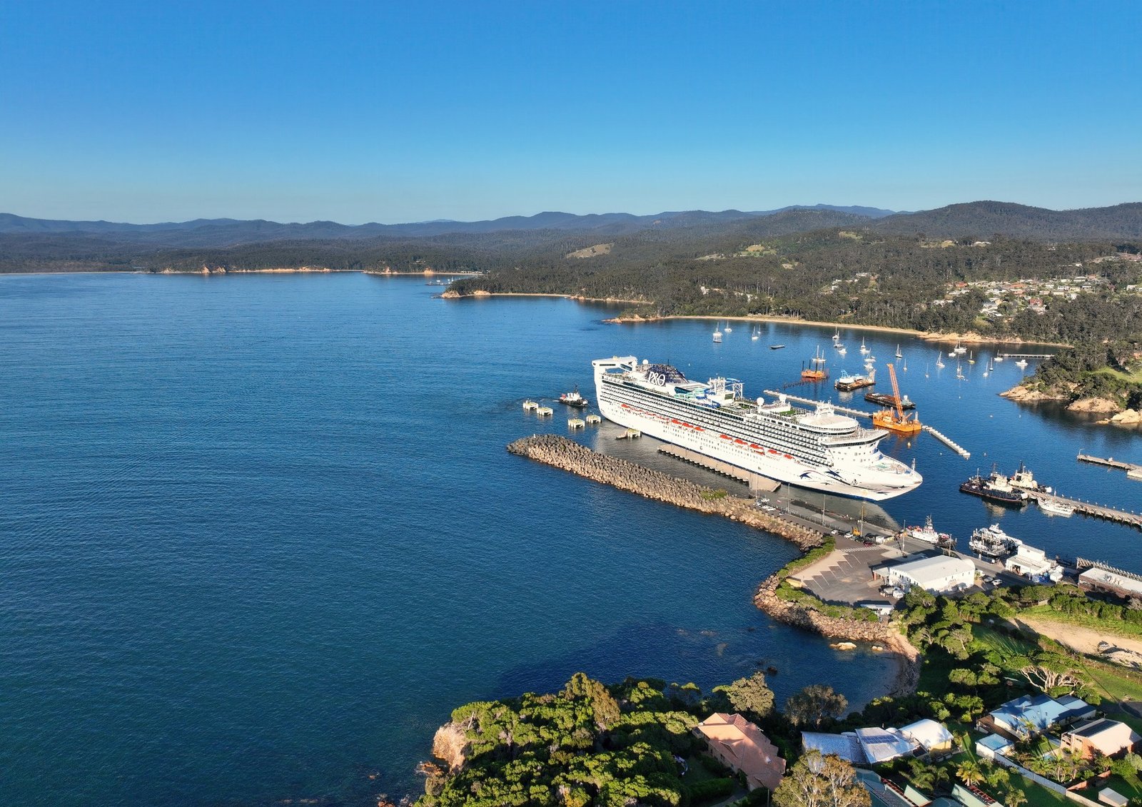 A grand panoramic view of Twofold Bay, featuring a large cruise ship docked at Snug Cove Wharf. The deep blue waters stretch towards the horizon, framed by soft hills and vibrant greenery, showcasing Eden as a picturesque maritime hub where natural beauty meets bustling activity.