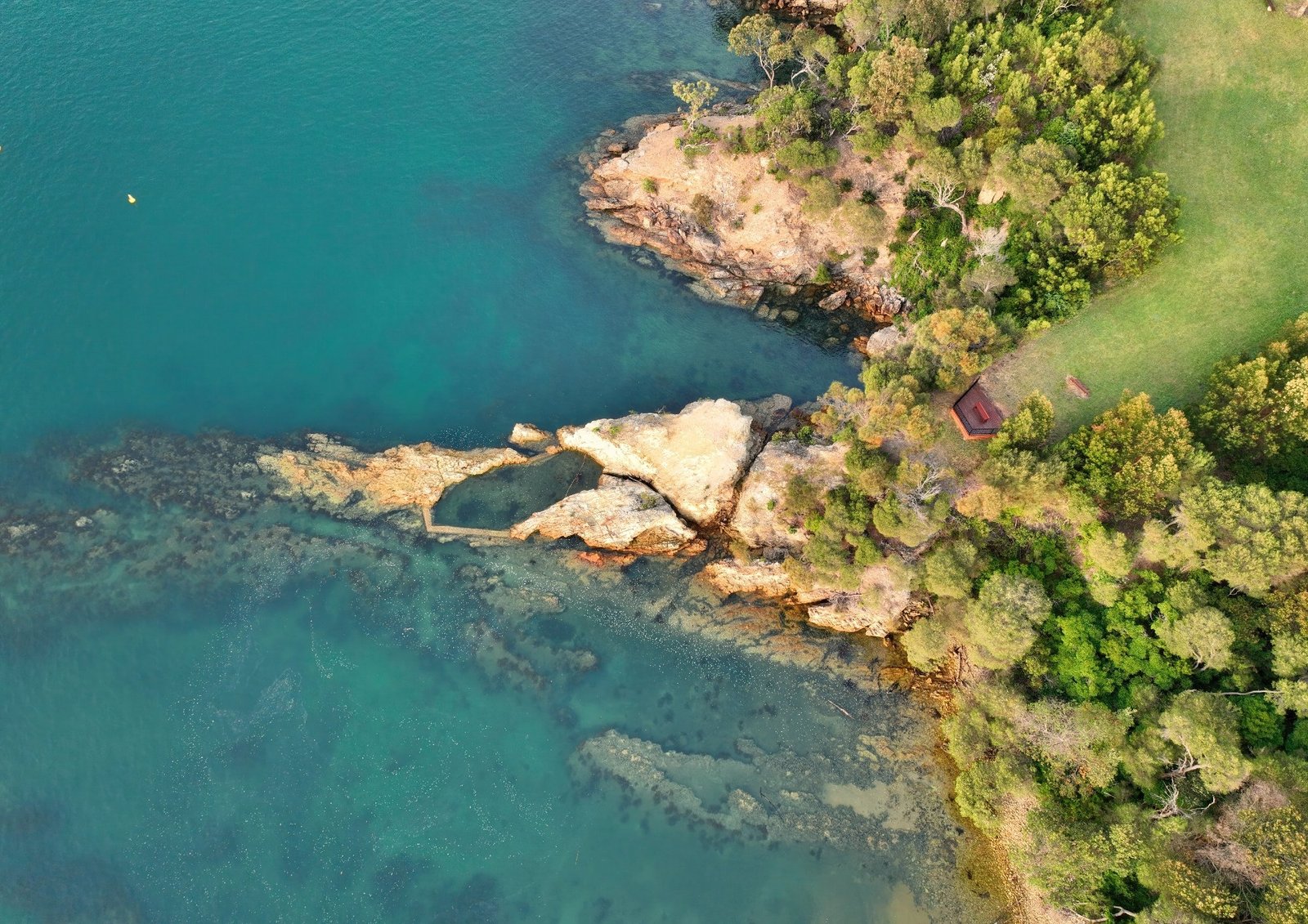 A top-down view of the natural Thompsons Point Baths, with intricate rock formations leading into clear turquoise pools. The contrasting patterns of the rocks and sea form a secluded and peaceful winter retreat, making it a perfect mid-year escape for those seeking solitude along the coastline.