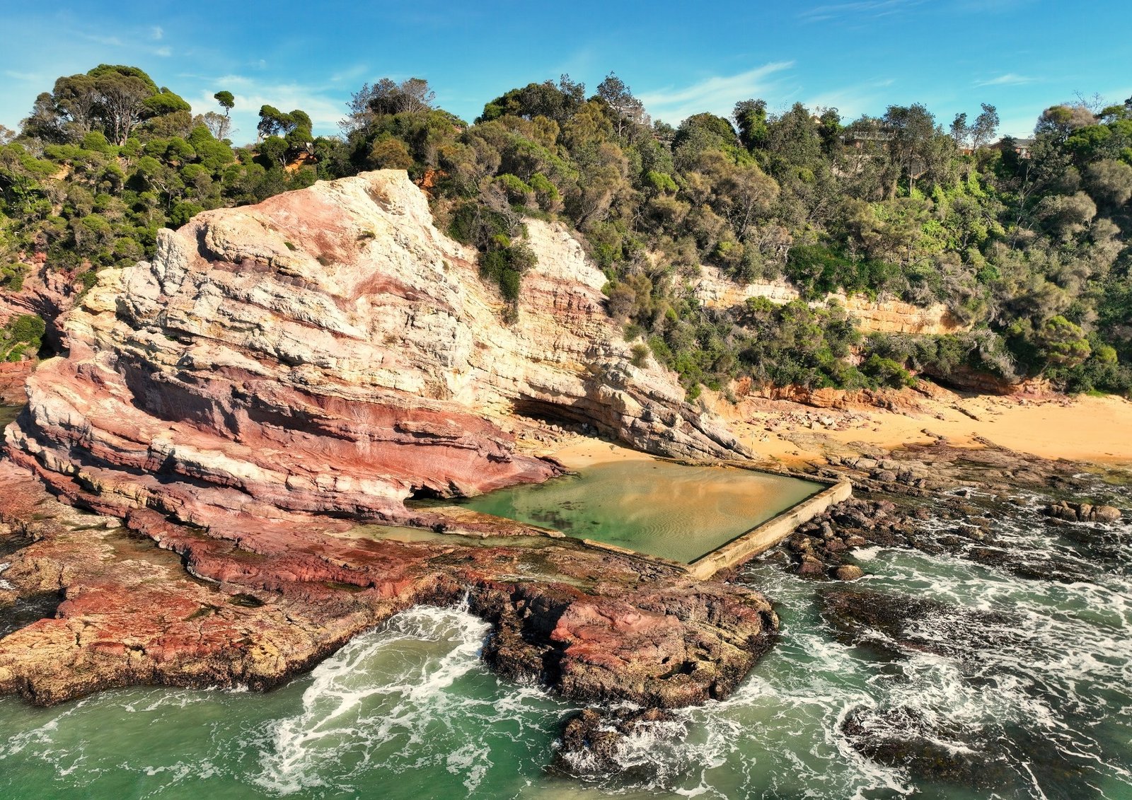 A close-up of the iconic Aslings Beach Ocean Pool, surrounded by vibrant red and orange rock formations. Energetic waves crash against the pool’s edges, where turquoise waters meet the rugged coastline. This unique natural landmark, perfect for an autumn visit, is a favourite among locals and visitors alike.