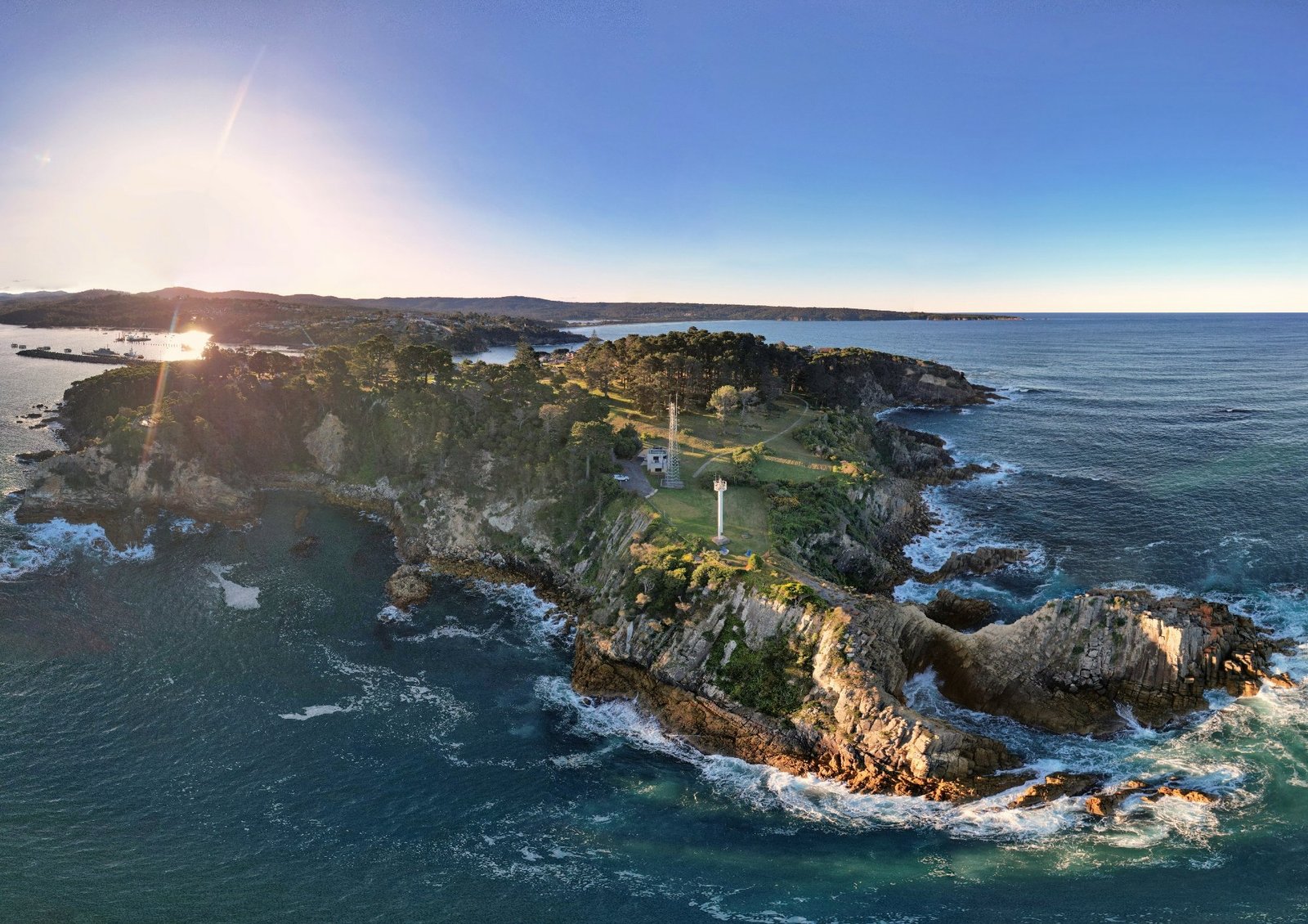 An aerial view of Eagles Claw Lookout and its beacon, perched on a rugged headland. The towering cliffs rise majestically against the deep blue ocean, offering sweeping views over Twofold Bay. This dramatic coastal landscape embodies the sense of adventure and wild beauty that defines Eden’s pristine coastline.