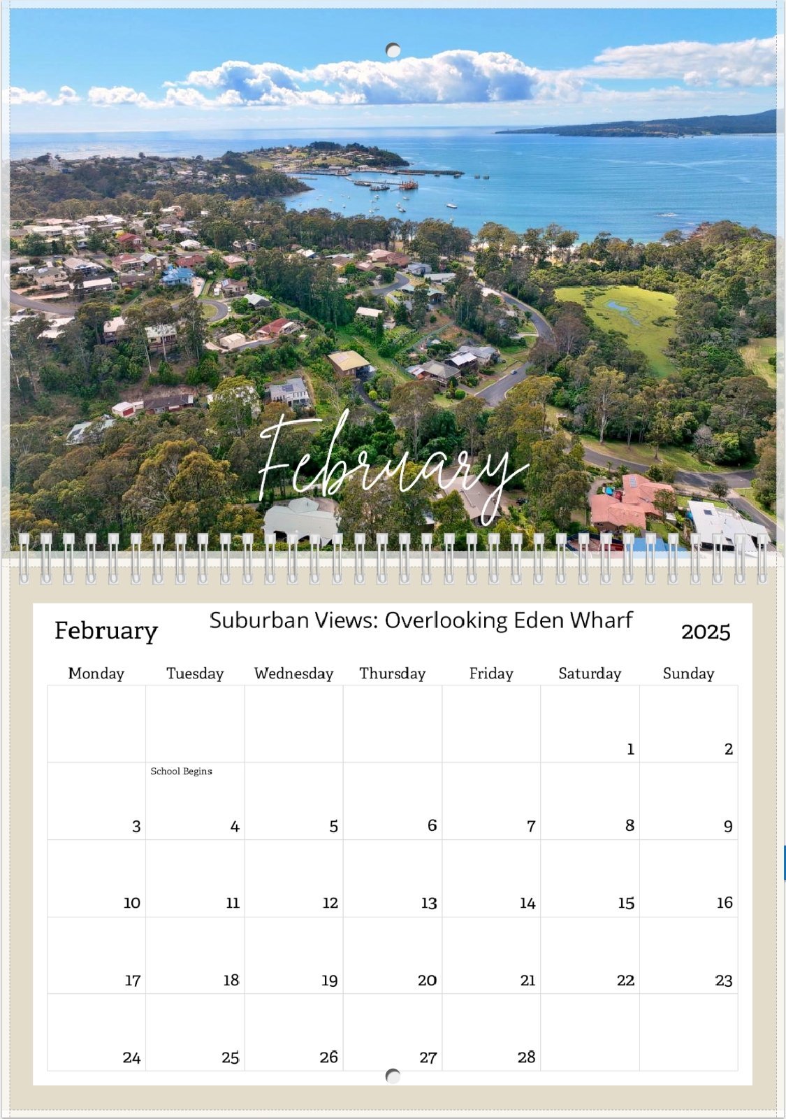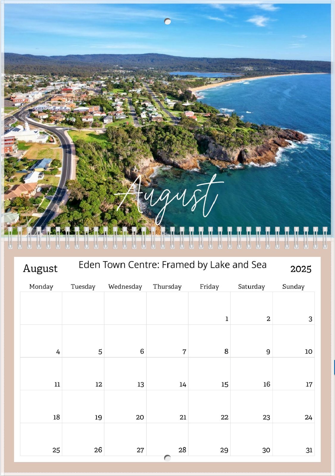 A stunning aerial view of Eden’s town centre, with Lake Curalo visible in the distance. The town’s roads weave through lush greenery toward the rocky coastline and the vast ocean, capturing the seamless blend of urban life and natural beauty as winter gently gives way to spring.