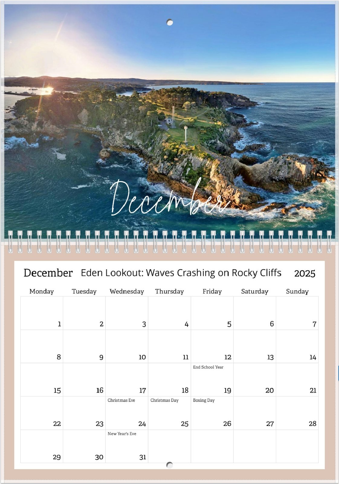 12. December: "Eden Lookout: Waves Crashing on Rocky Cliffs"