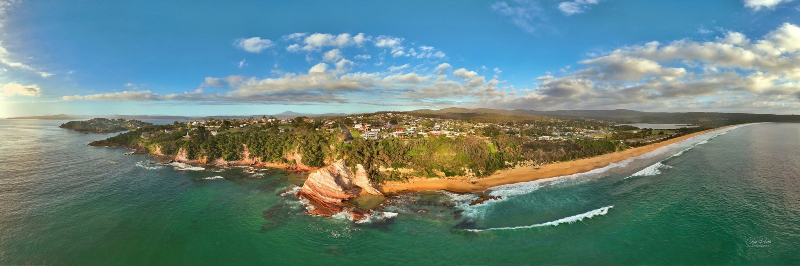 Gazing upon the splendid panorama of Aslings Beach Rock Pool in Eden, NSW, one can't help but be swept away by the tranquil haven that unfolds at the touch of dawn's early light. This vibrant image, captured in a 180-degree view, serves as a prelude to the expansive 360-degree drone video that gently sweeps from the rock pool to the wharf and back again. The rising sun casts a golden glow over the sleepy township, with the soft murmur of the South Pacific Ocean whispering secrets to the sandy shores and rugged headlands.